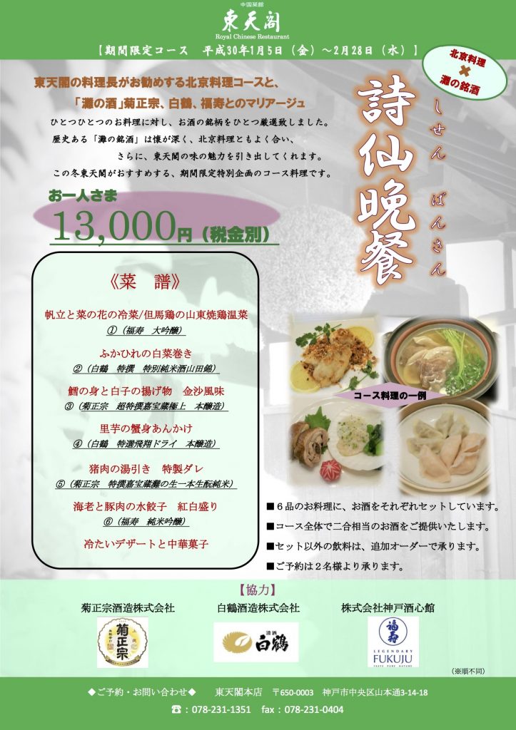 来年1月5日より2月末まで、トアロードにある名店「東天閣」にて灘の酒と北京料理のマリアージュをお楽しみいただけます。