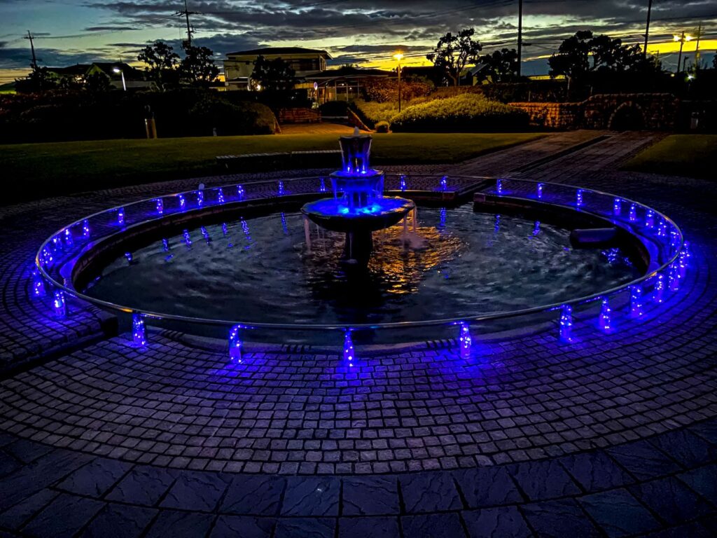 加東市でもこの趣旨に賛同し、市役所前メモリアルガーデンのモニュメントと噴水をブルーライトアップします。