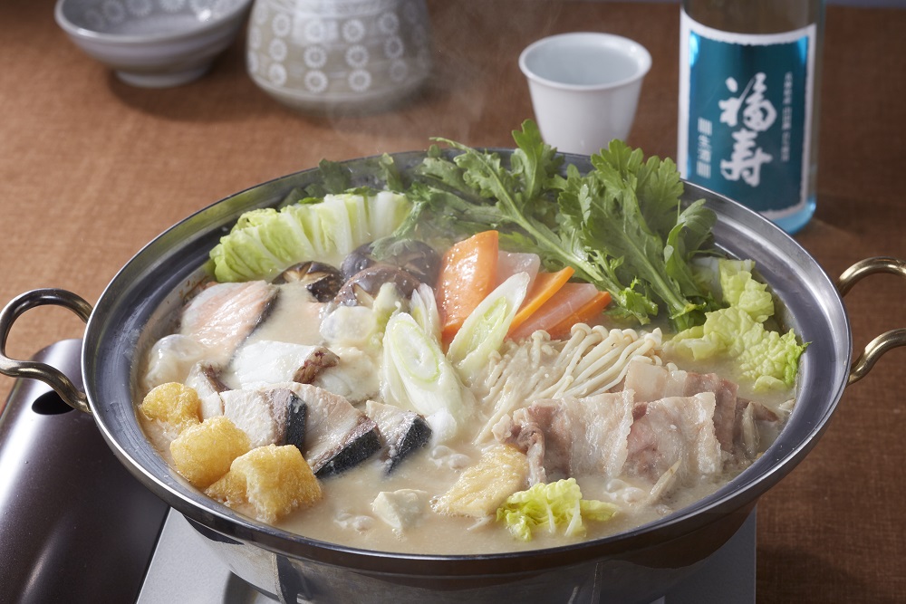 粕汁は、農林水産省のHP内「うちの郷土料理」にも掲出されているほどで兵庫県ではおなじみの一品。その鍋バージョンとでもいうべき料理が「さかばやし」で人気の「酒屋鍋」なのです。それは、「福寿」酒粕をたっぷり使用し、白味噌と和風だしで合わせたまろやかな味。鰤や鮭、豚肉や様々な野菜が入っているので、それらのだしも出て風味豊かな鍋料理になっています。酒粕は、調理に用いると、酒香が付くばかりではなく、食材を柔らかくしたり、味をまろやかにする効果も。おまけに食材の旨みを引き出してくれる効能もあるのです。栄養面では、タンパク質、ビタミンB1・B2・B6、葉酸、パントテン酸、食物繊維を含んでいるためにとってもヘルシー。健康的要素が注目されるスーパーフードともいえます。その昔、蔵人達は、酒造りのために暖房のなかった酒蔵に入って仕事をしていました。そんな冷え切った身体を暖めてくれたのが、仕事の後の酒粕鍋(酒屋鍋)だったのです。「さかばやし」では、蔵の料亭らしく、古えの酒粕鍋を再現し、日本料理の一つとして提供しています。