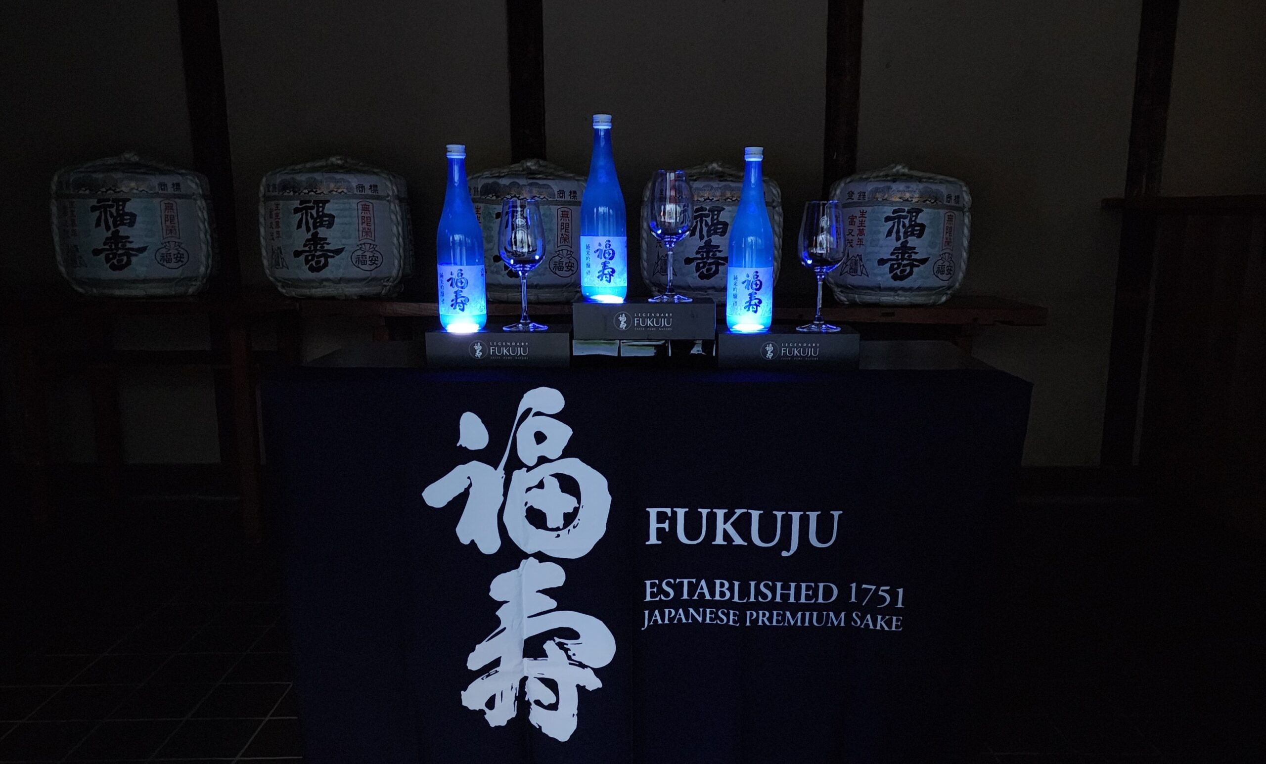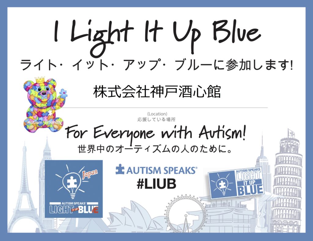 神戸酒心館では、ランドマークを青色にライトアップする活動「LIGHT IT UP BLUE」に賛同し、ライトアップ施設として協力しています。本期間は、福寿を代表するブルーボトル「福寿 純米吟醸」をライトアップし、やさしい青の光で空間を演出いたします。