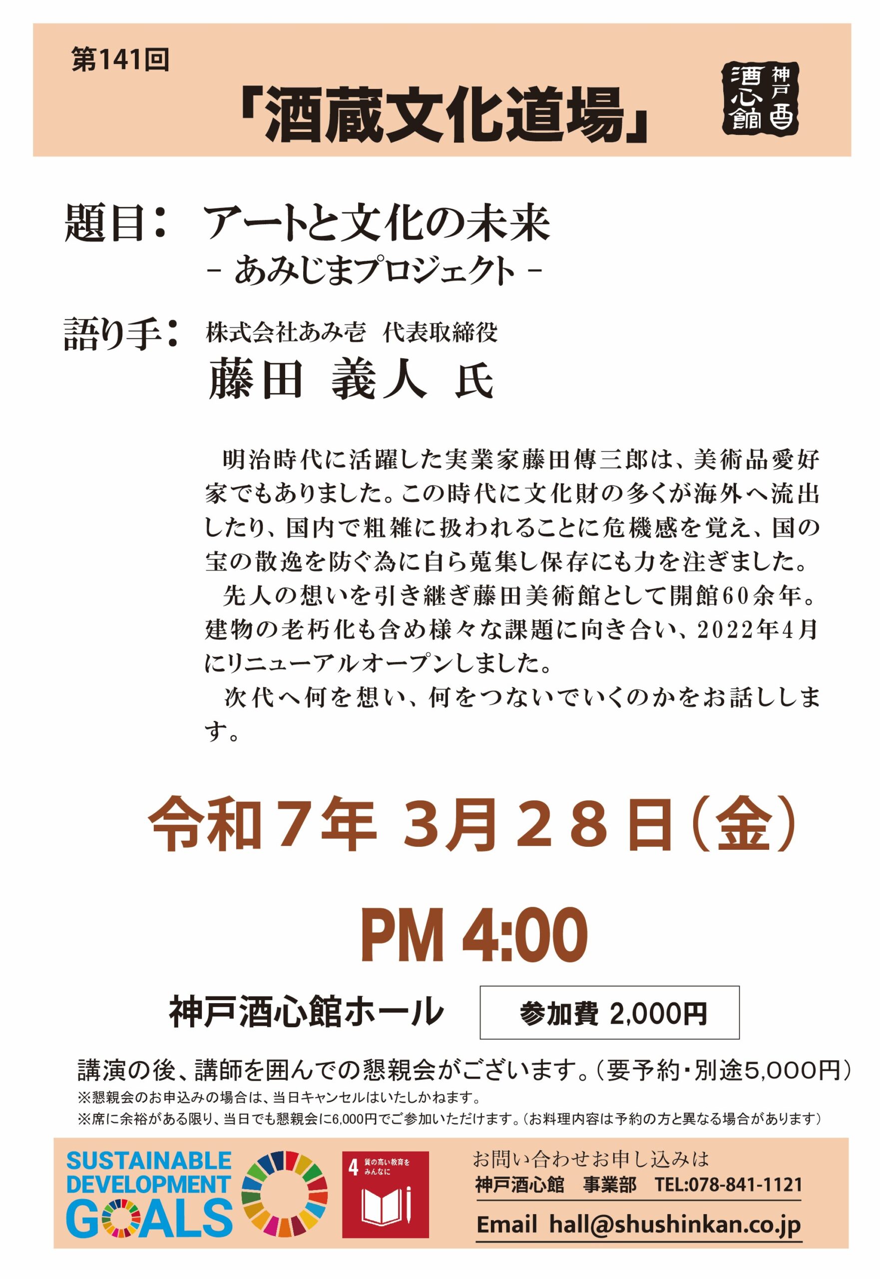 ≪酒蔵文化道場とは?≫ 第141回 酒蔵文化道場 ≪題目≫ アートと文化の未来 -あみじまプロジェクト- ≪語り手≫ 株式会社あみ壱 代表取締役 藤田 義人 氏 ≪内容≫ 明治時代に活躍した実業家藤田傳三郎は、美術品愛 […]