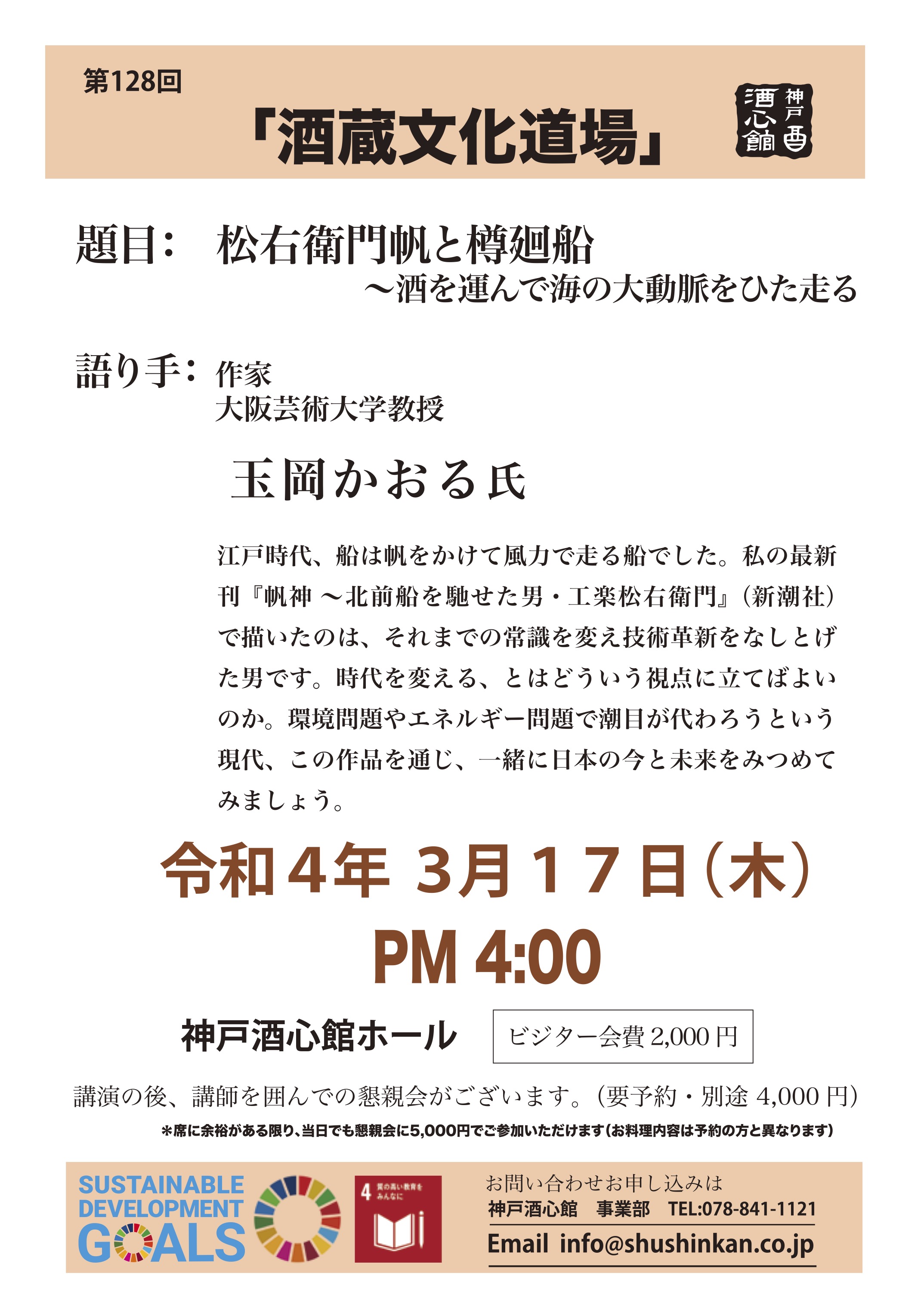 ≪酒蔵文化道場とは?≫ 第143回 酒蔵文化道場 ≪題目≫ 神戸と映画の素敵な関係 ≪語り手≫ 一般財団法人神戸観光局 神戸フィルムオフィス 課長 土屋 千佳 氏 ≪内容≫ 最近、神戸で撮影された映画やドラマを目にするこ […]
