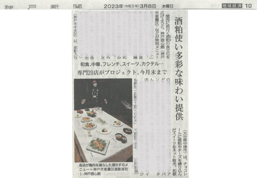 神戸新聞の2023年3月8日の朝刊に「酒粕使い多彩な味わいを提供」の見出しで『酒粕プロジェクト』が紹介されました。 2023年2月17日配信の神戸新聞NEXTでも記事をご覧いただけます。 酒かす使った和食やスイーツ、カク […]