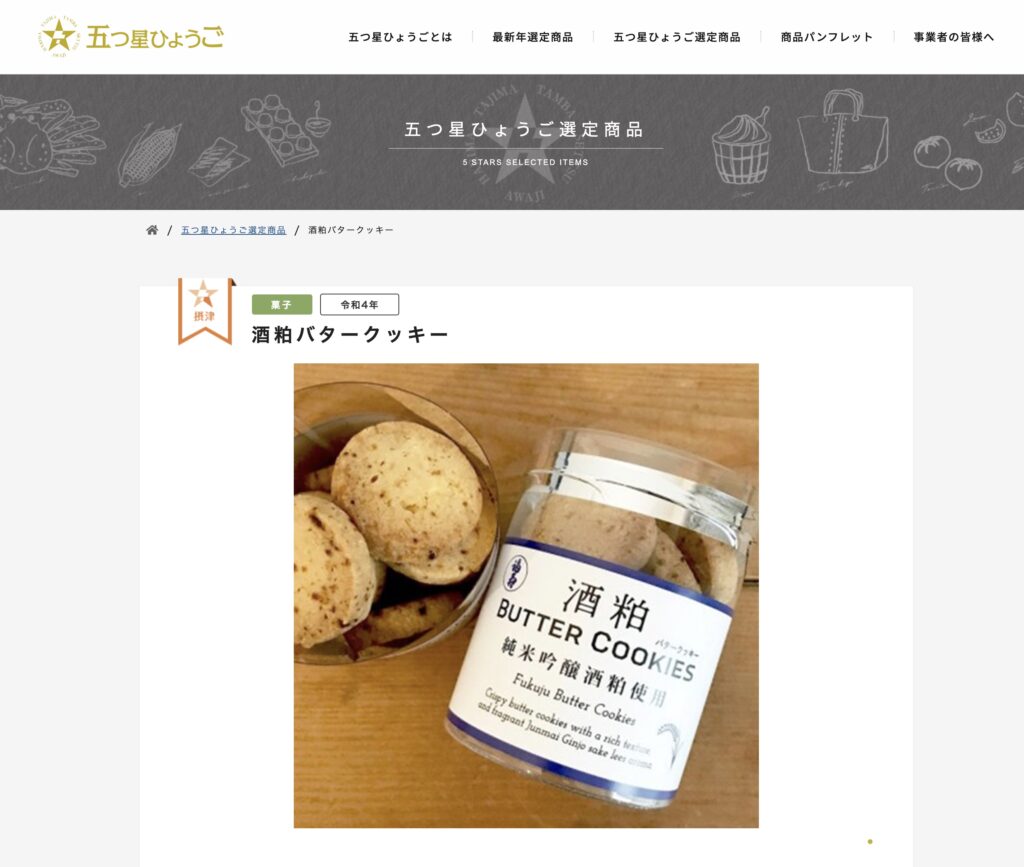神戸酒心館とオリンピア岩屋がコラボをした人気商品「福寿 酒粕バタークッキー」が兵庫県の「五つ星ひょうご」に認定されました。 五つ星ひょうご菓子 令和4年「酒粕バタークッキー」