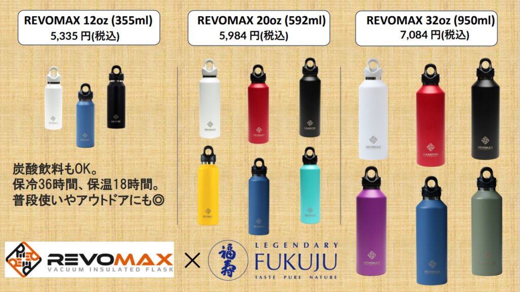 REVOMAXは「FUKUJU KEG DRAFT」などの炭酸を含む液体が注入可能、「指3本」でワンタッチ開閉できるキャップが特徴の二重ステンレス真空断熱。保冷36時間・保温18時間も可能な高性能ボトルです。 様々なサイ […]