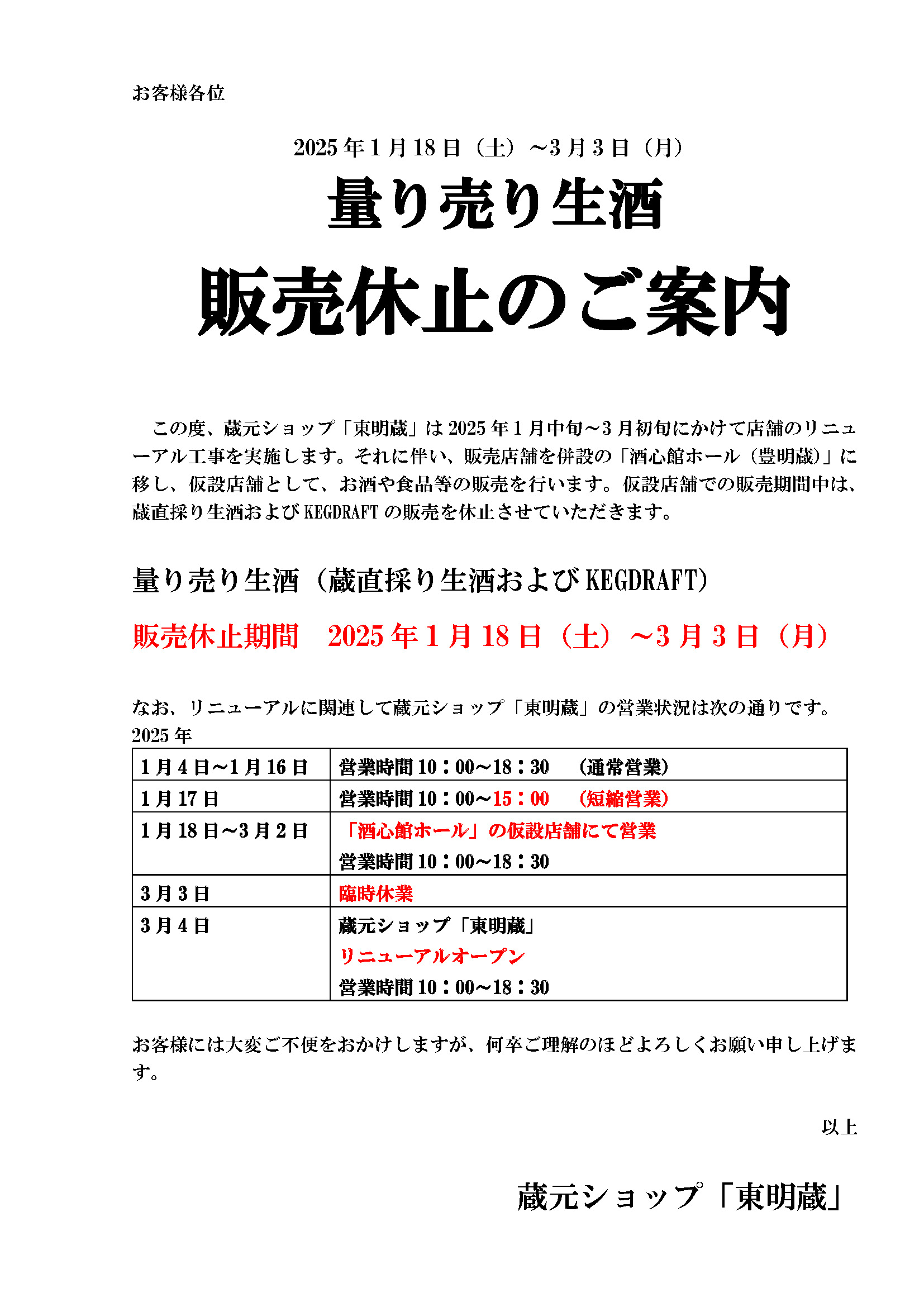 量り売り生酒 販売休止のご案内【2025年1月18日(土)~3月3日(月)】