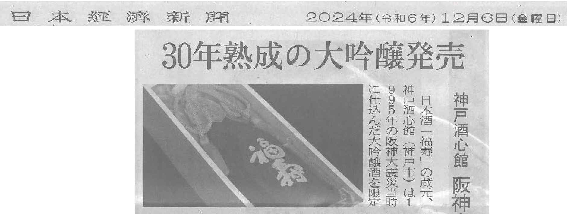 2024年12月4日配信の日本経済新聞のwebで阪神淡路大震災を乗り越えた日本酒「福寿 復興の一滴」が紹介されました。