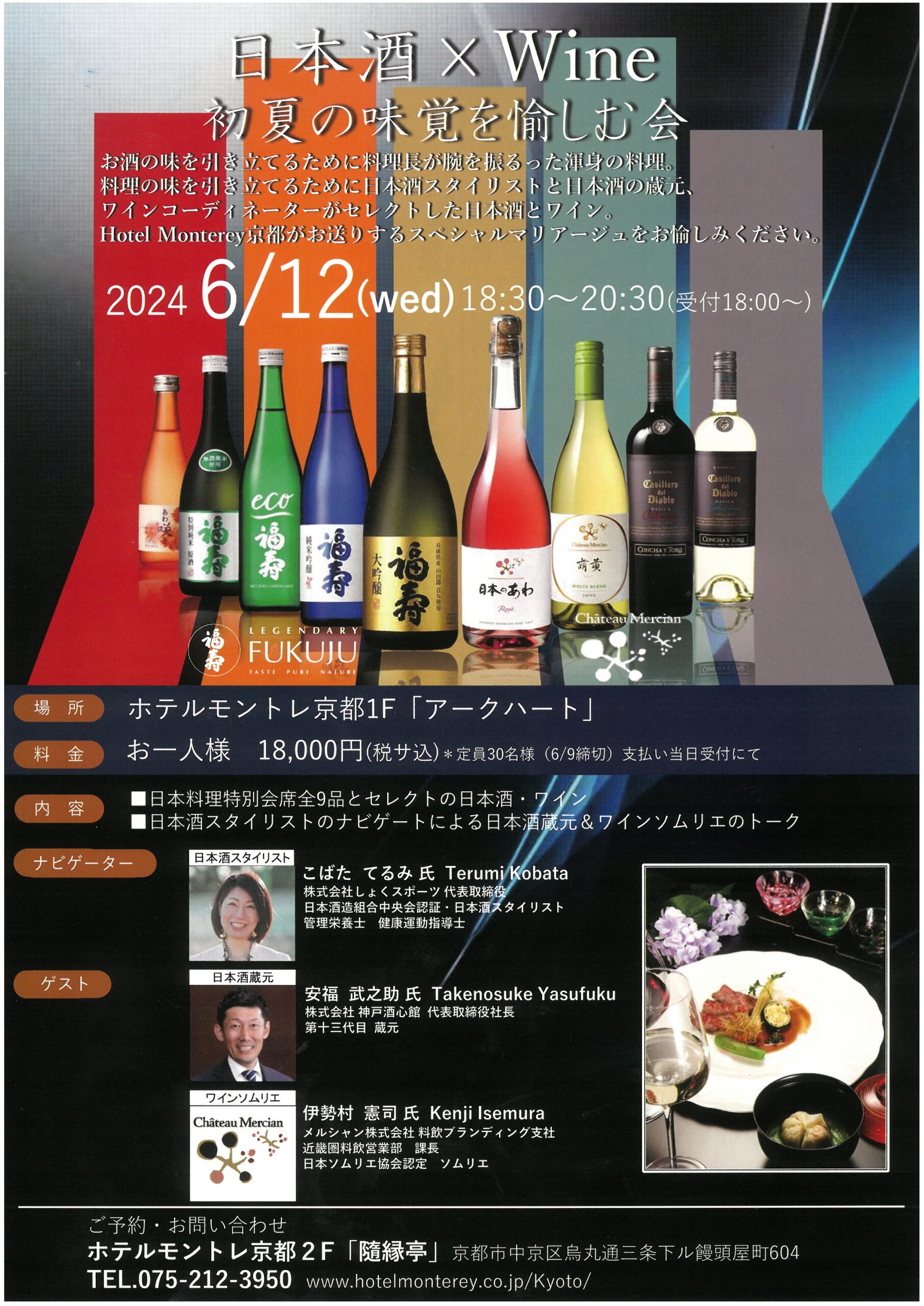 ホテルモントレ京都で日本酒スタイリストこばたてるみ氏のナビゲートで「福寿」の日本酒と「メルシャン(株)」のワインとコラボイベント「日本酒xWine 和特別会席 ~初夏の味覚を愉しむ会~」が開催されます。