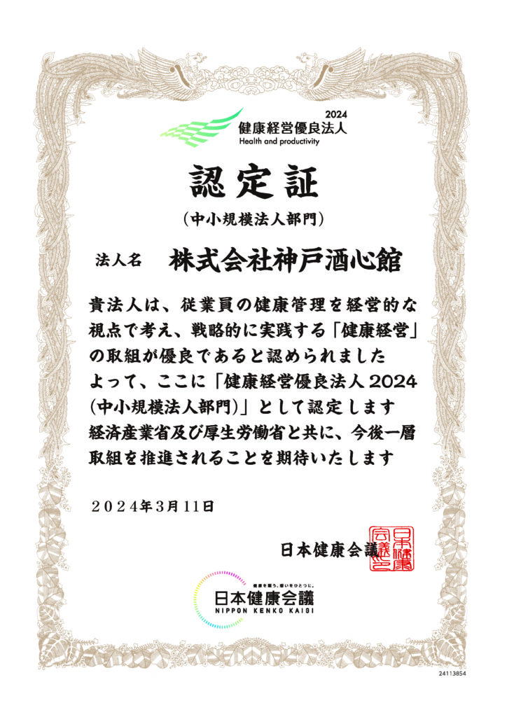 神戸酒心館では従業員への健康経営を実践しており、2024年3月11日に「健康経営優良法人2024(中小規模法人部門)」に認定されました。