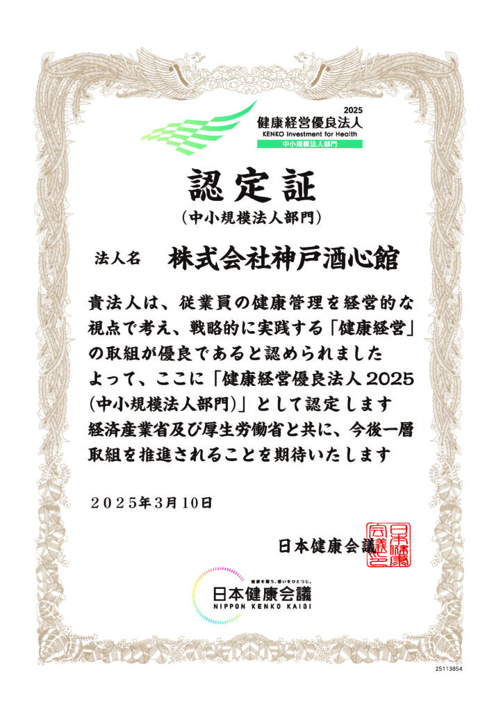 神戸酒心館では従業員への健康経営を実践しており、2025年3月10日に「健康経営優良法人2024(中小規模法人部門)」に認定されました。