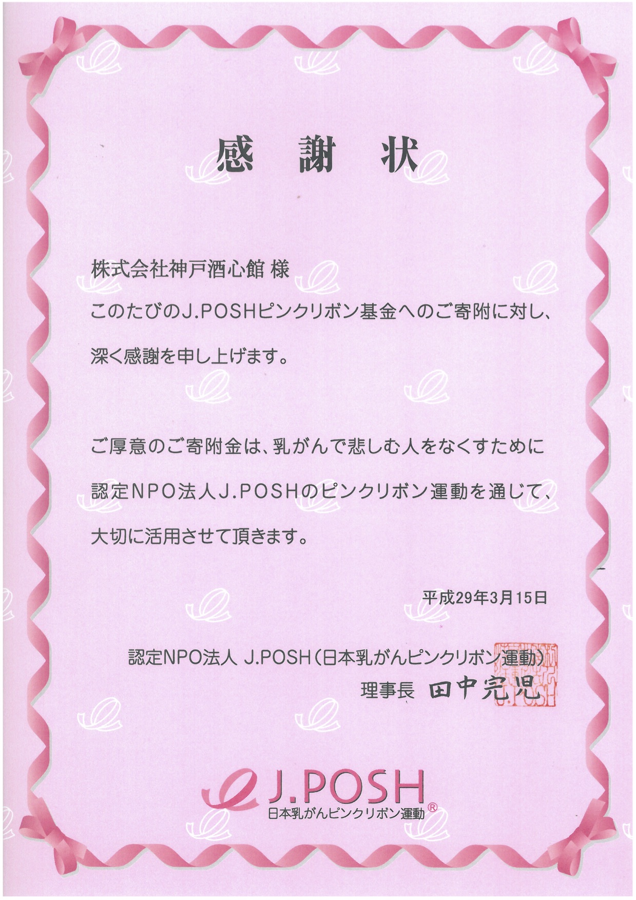 先日、認定NPO法人J. POSHピンクリボン基金へ寄付を行いました。
