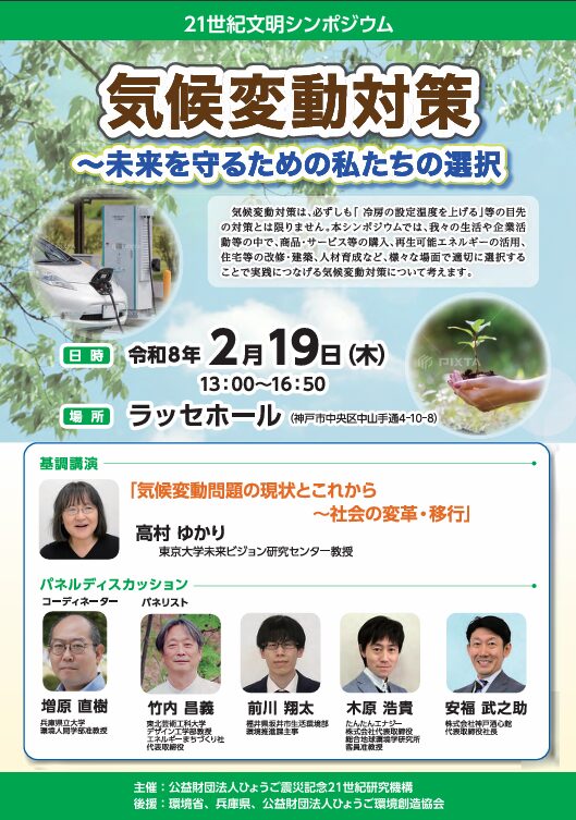 公益財団法人 ひょうご震災記念21世紀研究機構が主催する『21世紀文明シンポジウム「気候変動対策~未来を守るための私たちの選択~」』が2026年2月19日(木)に神戸のラッセホールで開催されました。