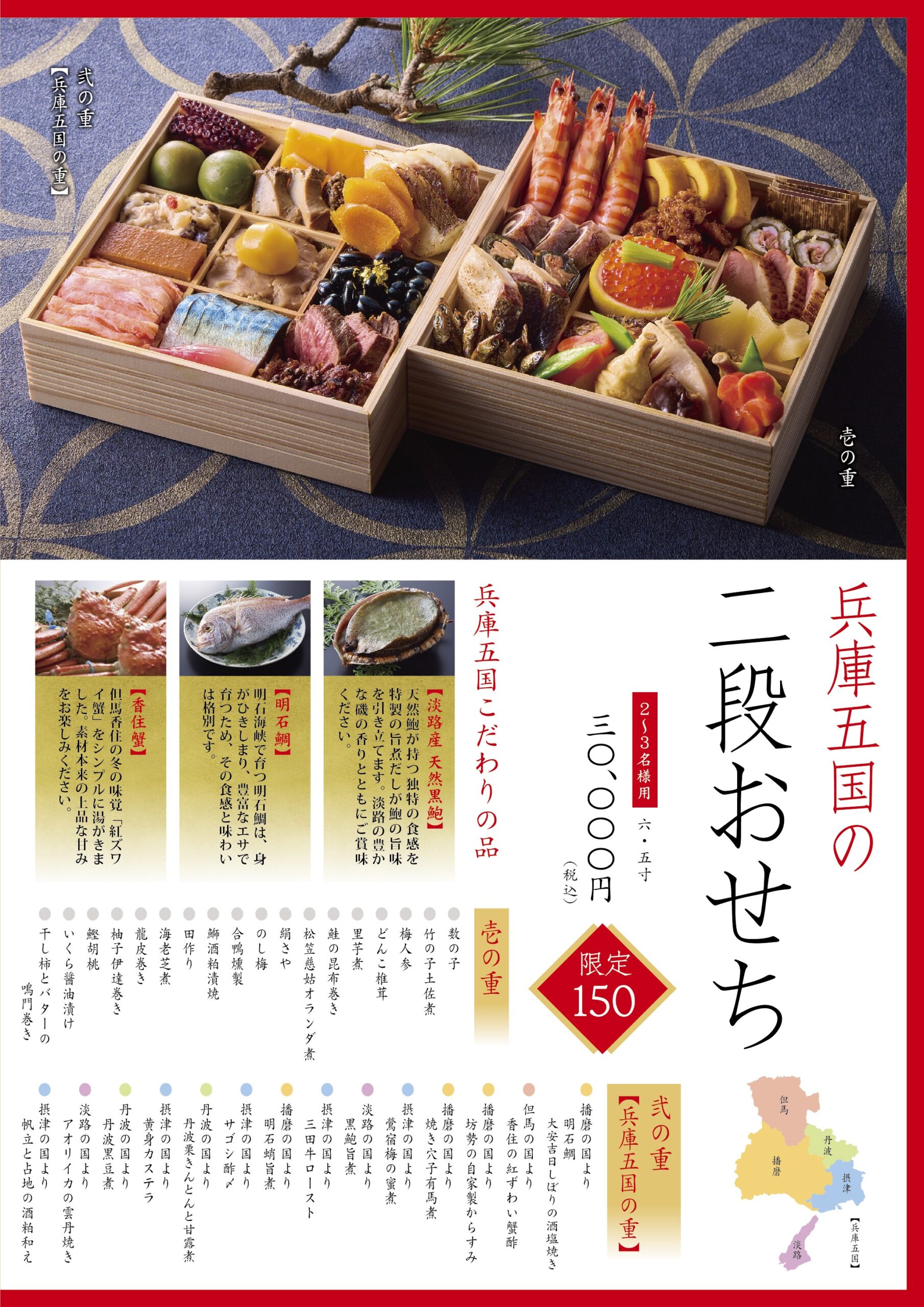 「二段おせち」は、「南淡路産天然黒鮑」や「天然明石鯛」や「香住ガニ」など、兵庫五国の幸などで仕上げたおせちです。